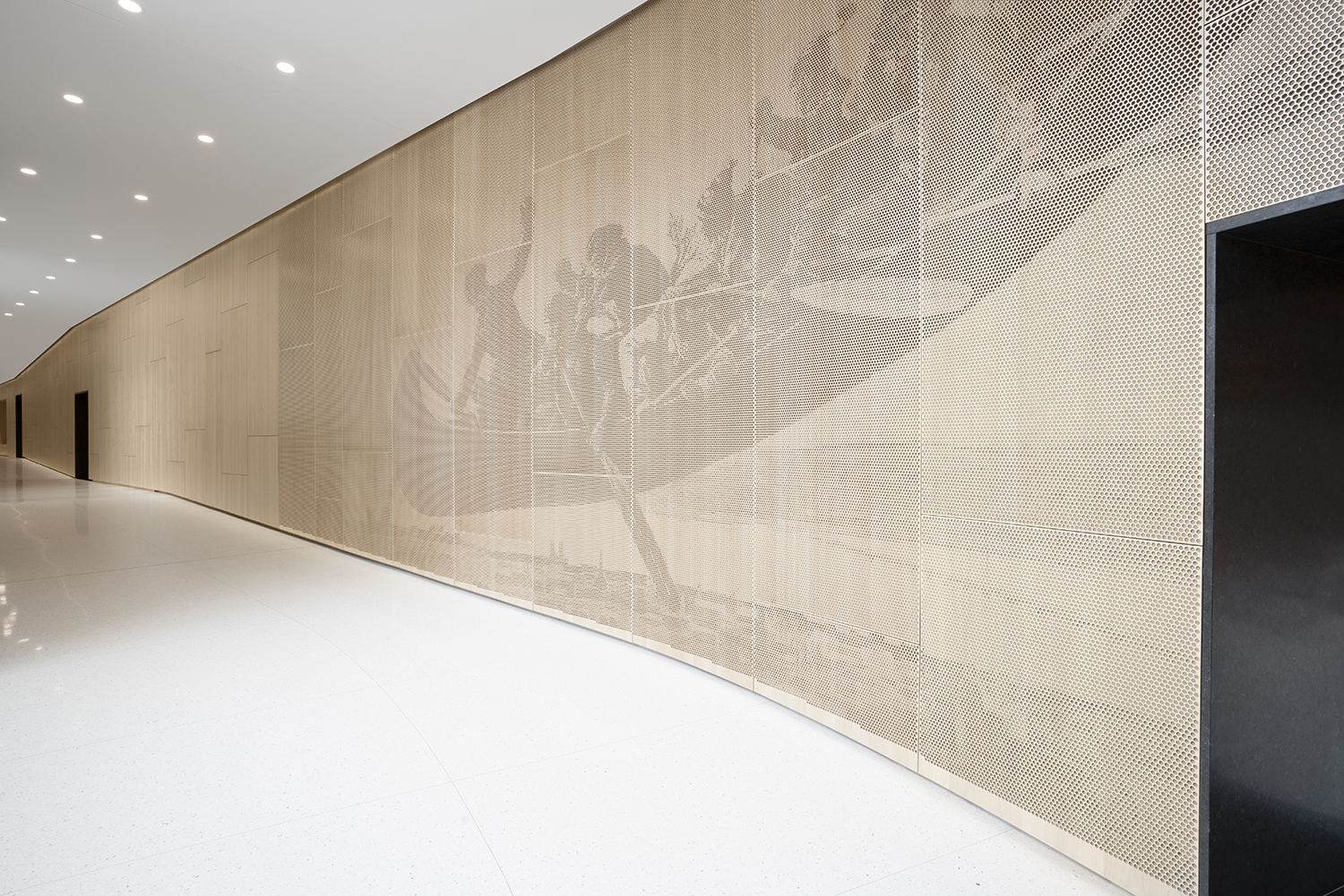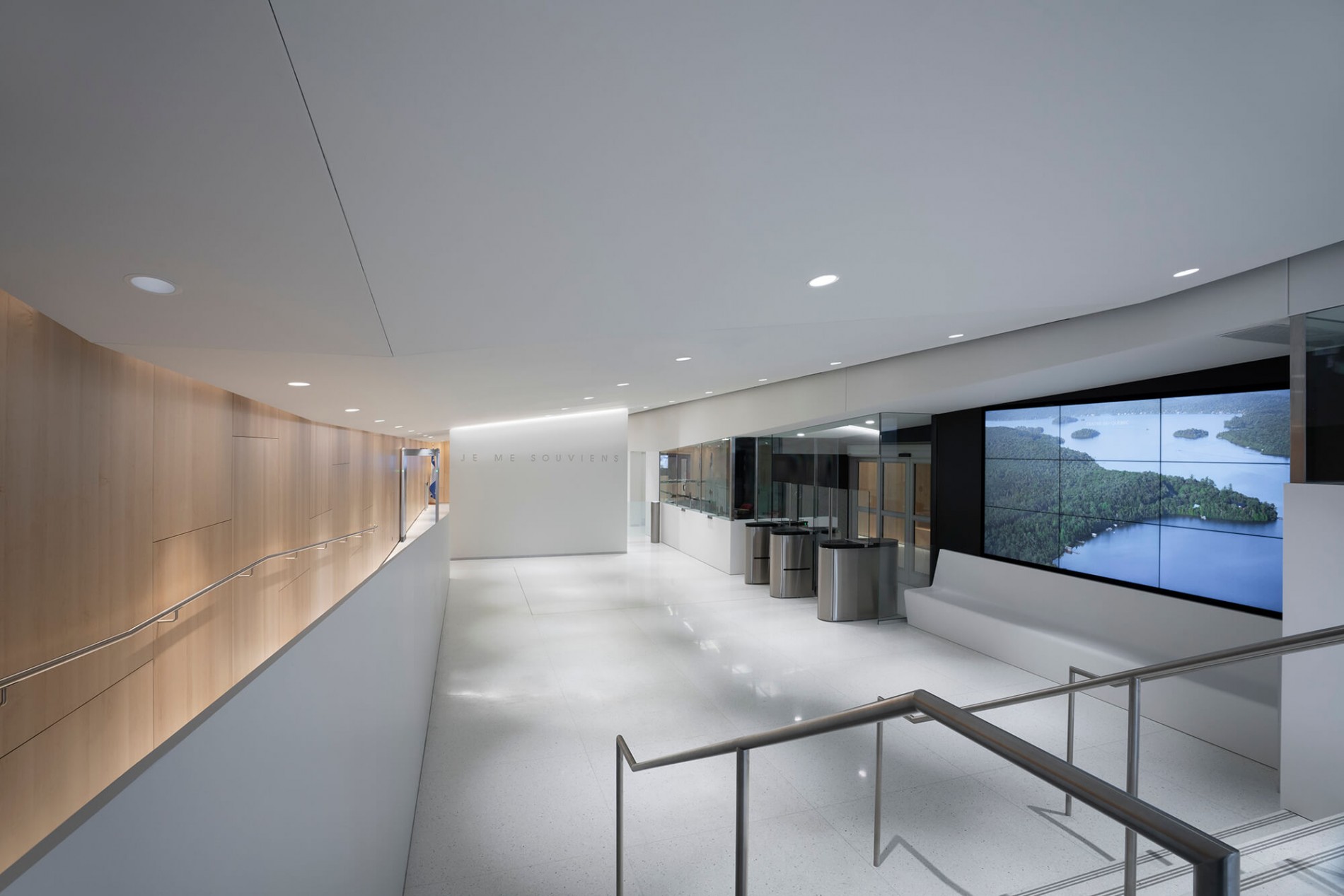Entièrement développé sous le paysage, le nouveau pavillon d’accueil de l’Assemblée nationale du Québec contribue à préserver la façade de l’Hôtel du parlement, symbole fort de la mémoire collective, tout en stimulant l’idée d’une démocratie vivante et participative. Une rampe spiralée distribue les différents espaces depuis l’entrée jusqu’au cœur de l’édifice. Le mur en bois qui compose ce parcours est la continuité du narratif inscrit sur l’Hôtel du Parlement, avec de grands thèmes reprenant l’histoire moderne du Québec, illustrée par des images évocatrices des notions de collectivité et de citoyenneté. En son cœur, une agora citoyenne offre au grand public un lieu de rassemblement et d’échanges, dominée par un gigantesque oculus, à la fois source lumineuse et fenêtre sur le passé.